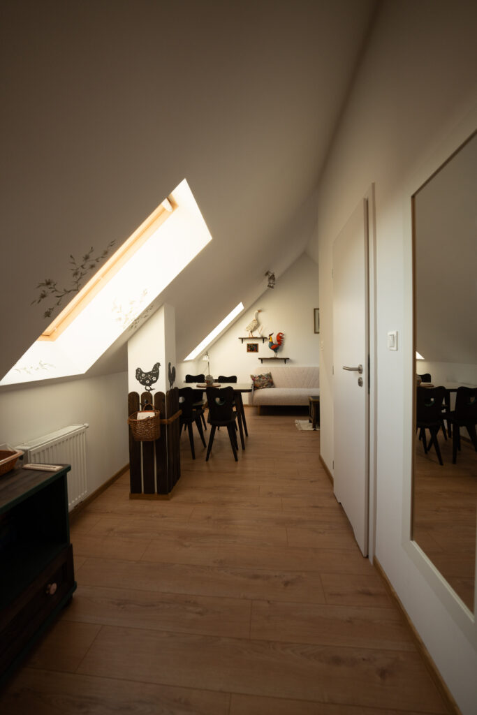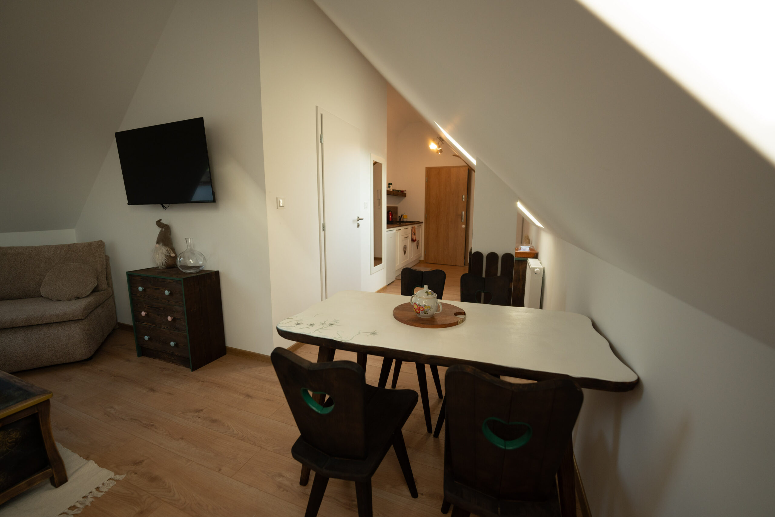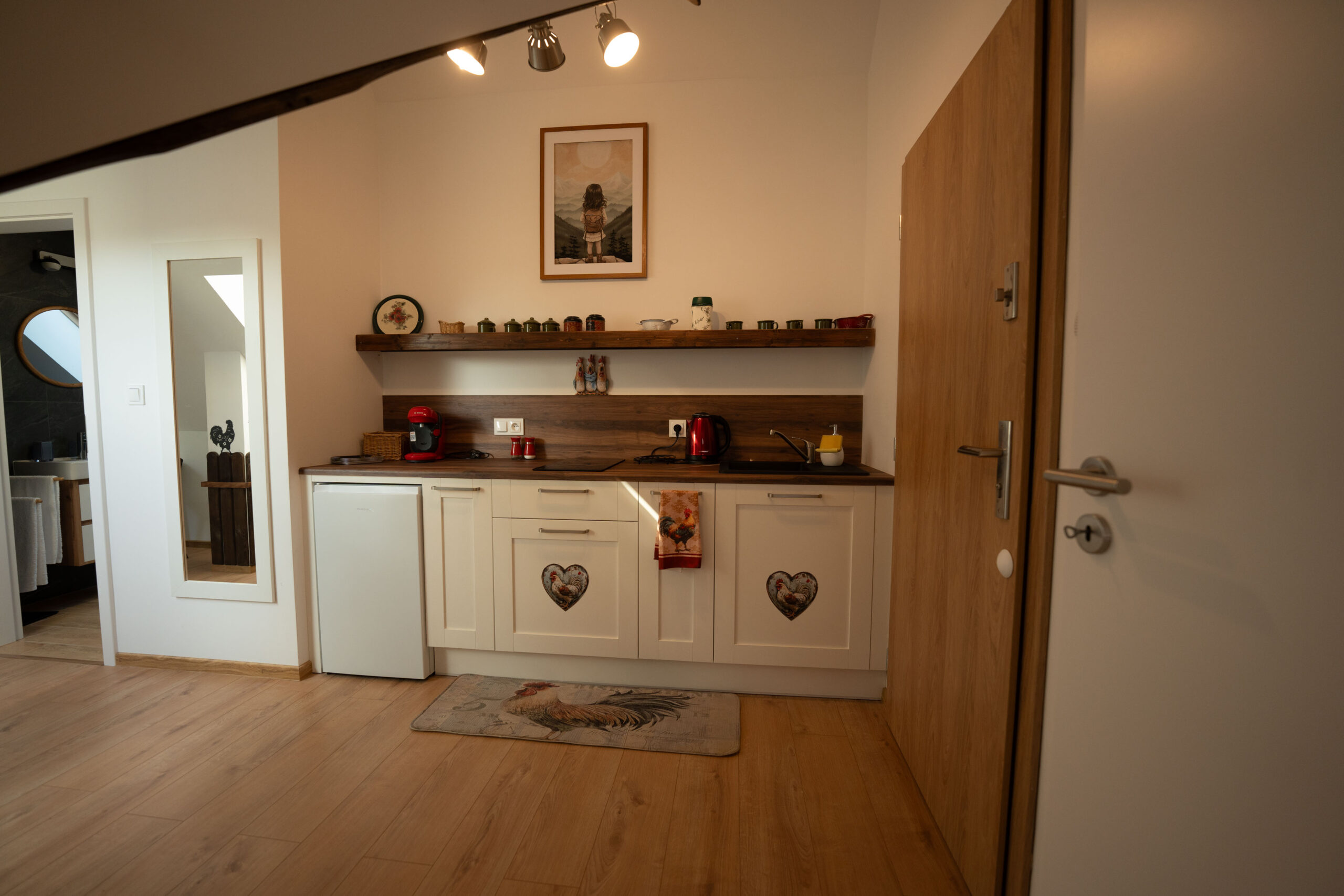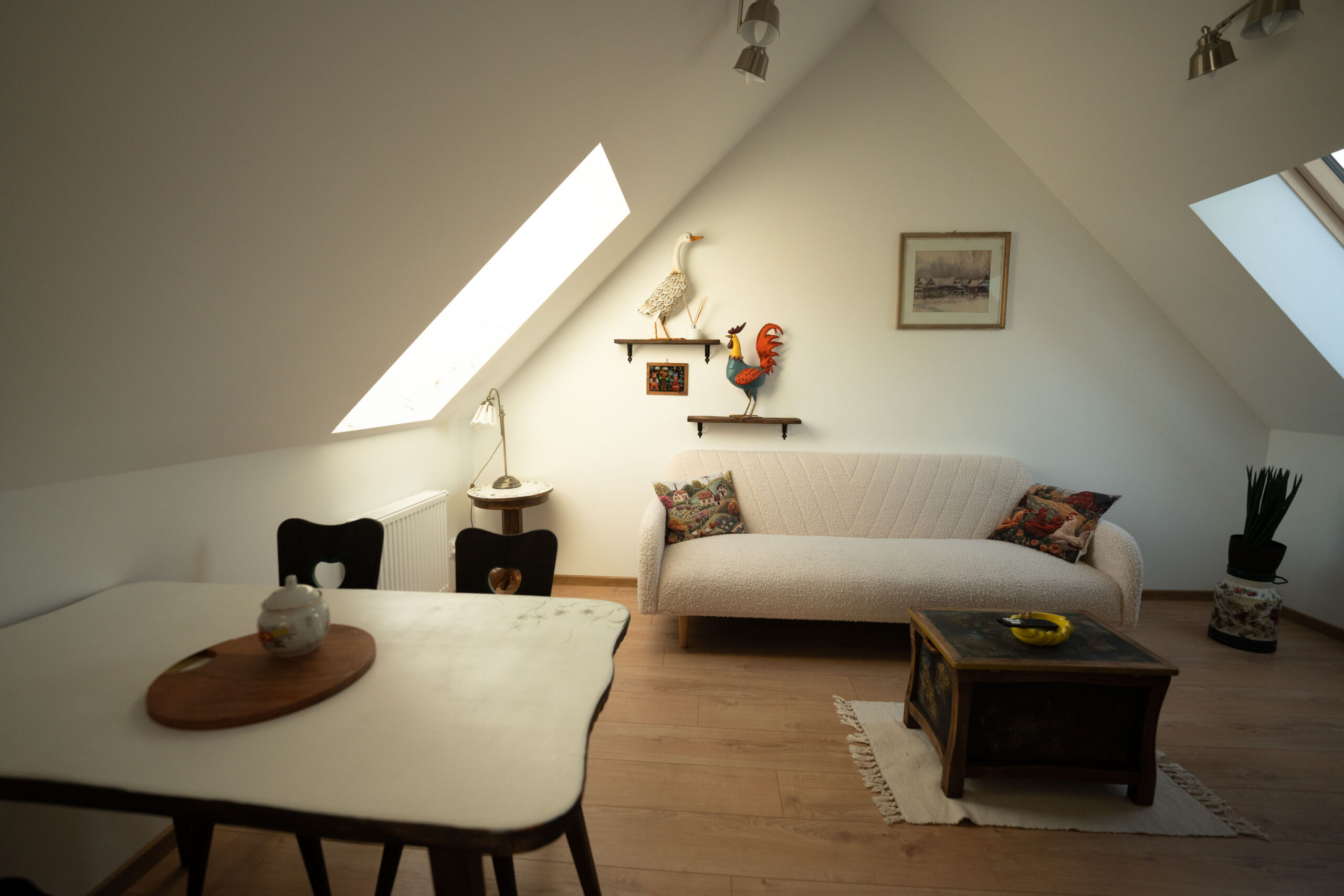 Poznaj Apartament „Kura” – najbardziej przestronny z naszych apartamentów, zaprojektowany z myślą o komforcie większych rodzin oraz grup przyjaciół. Stylowe, artystyczne wnętrze łączy nowoczesność z rustykalnym urokiem poddasza, tworząc niepowtarzalną atmosferę.