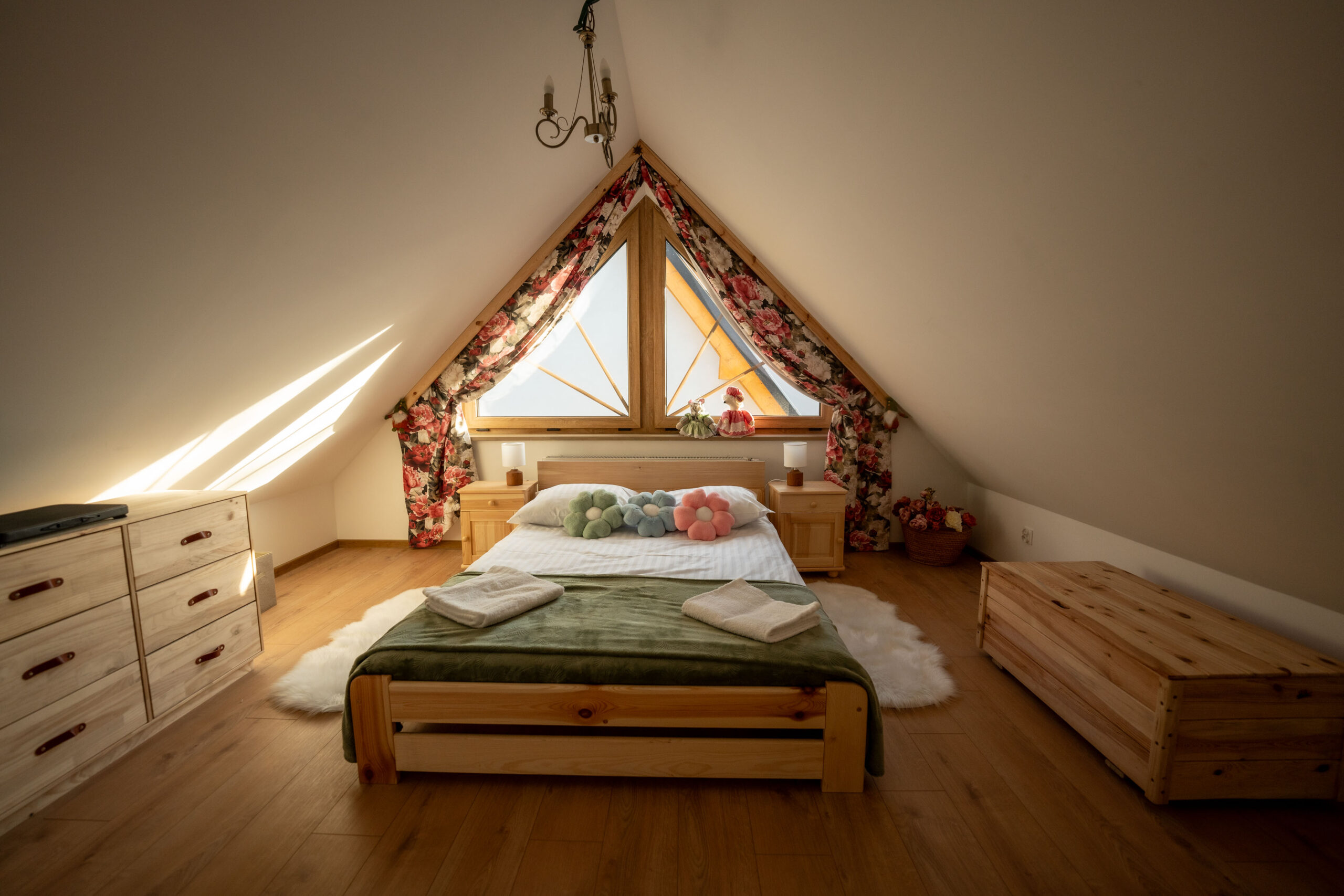 Wysokie skosy i okna dachowe, które dają dużo światła i charakteru
